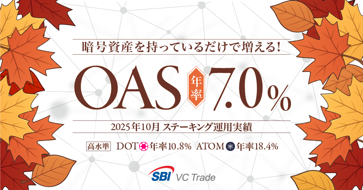 暗号資産を持っているだけで増える!オアシス(OAS)年率7.0%【ステーキング運用実績発表(2025年10月)】 ~DOTは年率10.8%、ATOMは年率18.4%と高水準キープ~