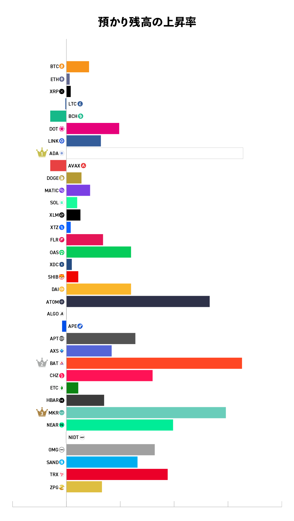 2025年8月の預かり残高の上昇率1位はカルダノ(ADA)、2位はベーシックアテンショントークン(BAT)、3位はメイカー(MKR)でした。