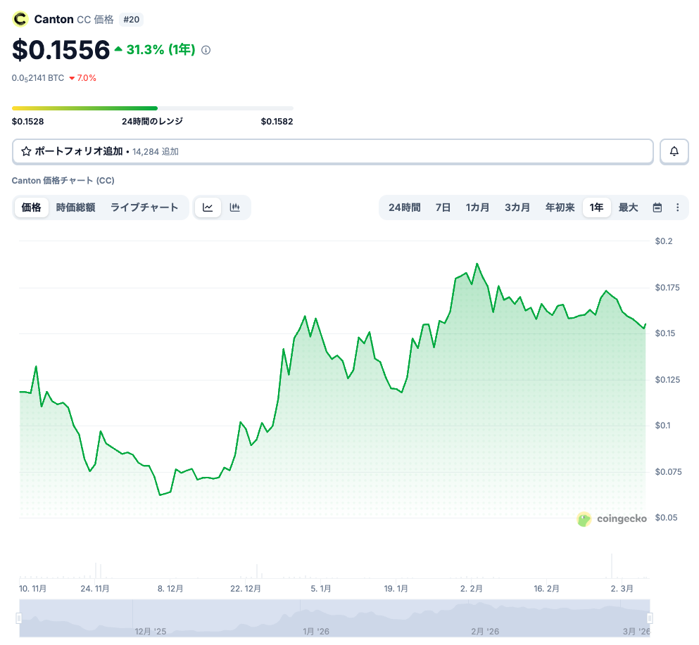 2026年3月6日時点のカントンコイン(Canton/CC)価格は$0.1556で、25年11月のカントンコイン(Canton/CC)取引開始以降の上昇率は+31.3%となっています(出典:CoinGecko)。