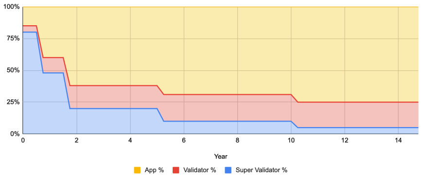 図5:ミントスプリット(配分比率)。初期はSuper Validatorが優先され、成熟期にはアプリプロバイダーが最大75%を受け取る。
