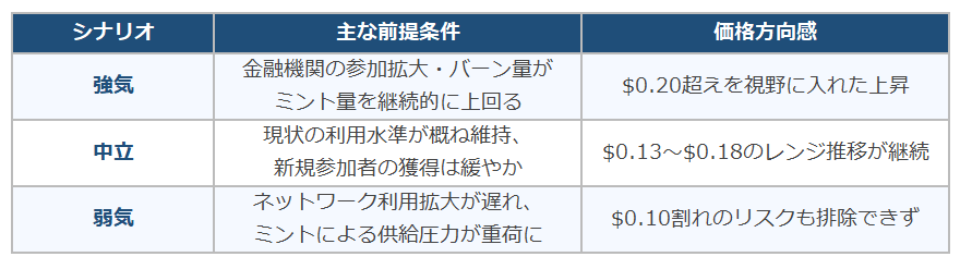 ネットワーク利用の拡大がバーン量を十分に押し上げなければ、供給過多が価格の下落圧力として働く可能性があります。