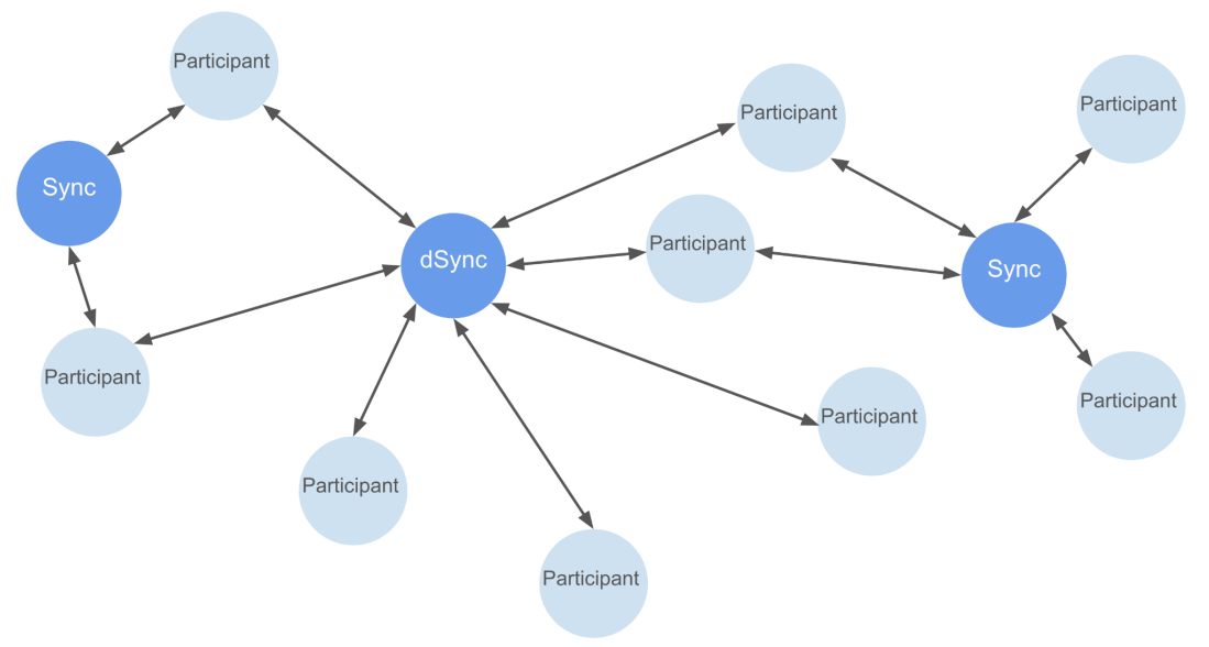 図2:Canton のネットワークトポロジー。参加者ノードが中央集権型(Sync)または分散型(dSync)のsync domainを介して接続される。