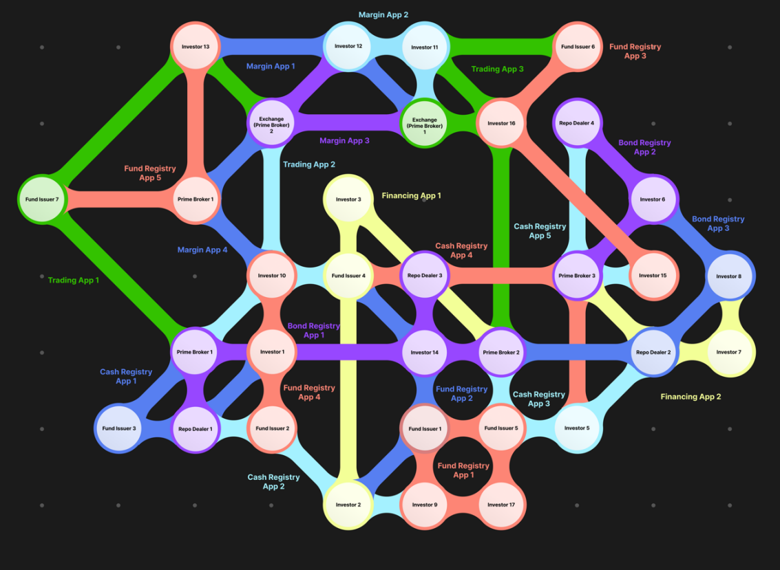 図1:Canton NetworkのNetwork-of-Networks構造。Margin App・Trading App・Bond Registry・Cash Registryなど多様な金融アプリが独立しながら相互接続される。