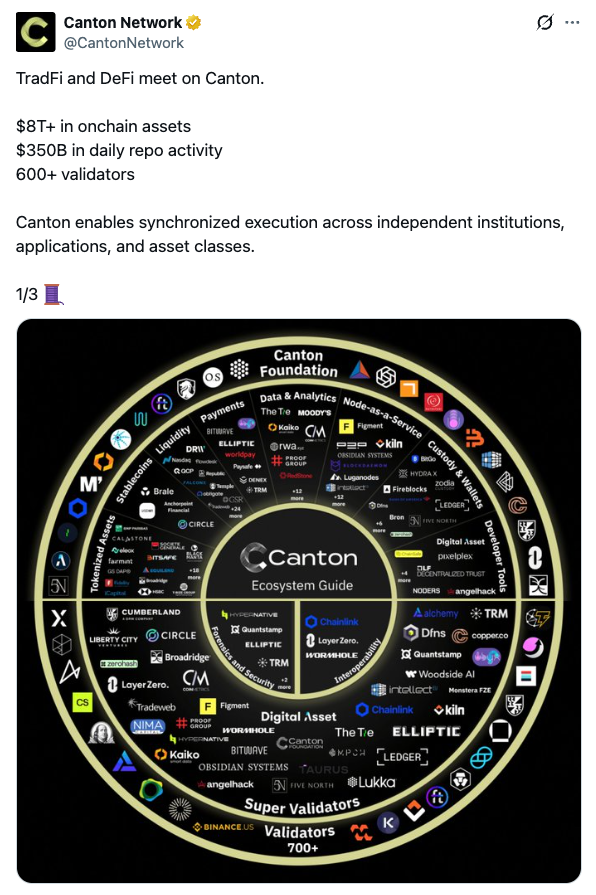 図0:Canton Network公式Xより(2026年3月4日)。オンチェーン資産$8T超・日次レポ$350B・バリデーター600+を公表