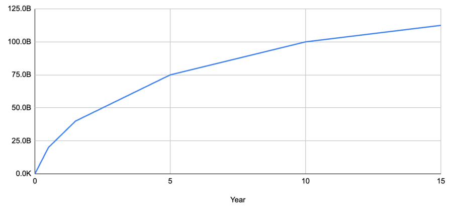 図4:累積ミント量推移。稼働開始から10年で1,000億CCに達し、以降は緩やかに増加。