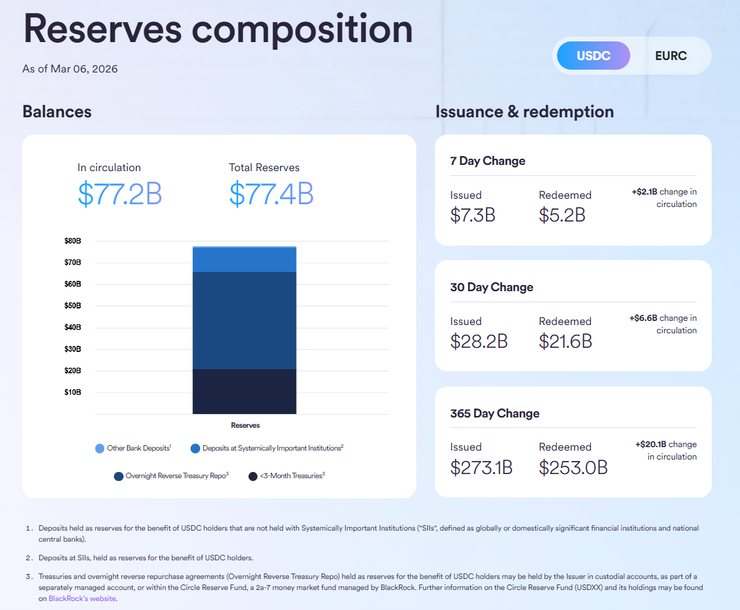 実際、準備金の内訳は「現金や短期の米国債など、換金しやすい資産」を中心に構成されていることが示されており、たとえば添付の画面(2026年3月12日時点)では、流通量(In circulation)約772億ドルに対して、総準備金(Total reserves)約774億ドルという形で表示されており、発行されているUSDC(USD Coin)の量よりも、やや多めの準備金が保有されていることが確認できます。