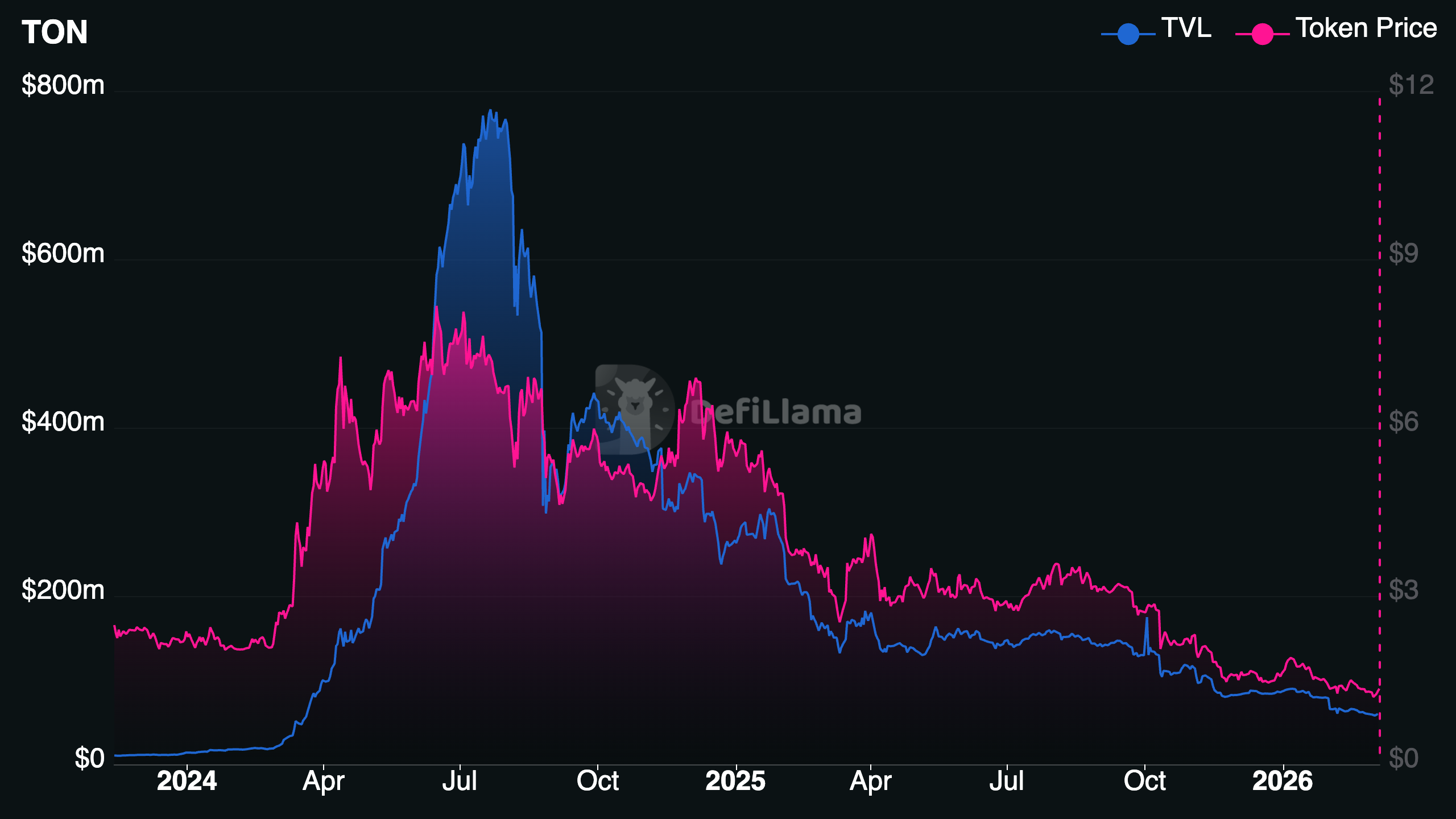 図1: TON TVL・TON Price推移(2024–2026)
