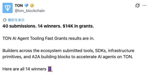 このグラントには、40件の応募から14件が選出され、LLMによるスマートコントラクト監査・AIエージェント間のM2M決済(TonPay 402)・オンチェーンAgentレジストリなどが採択されています。