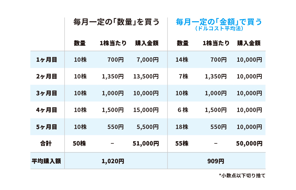 毎月10株ずつ一定の「数量」を買った場合、合計51,000円で50株、1株当たり1,020円で購入したのに対し、ドルコスト平均法を使って毎月10,000円分買った場合、合計50,000円で55株、1株当たり909円で購入できたことになります。