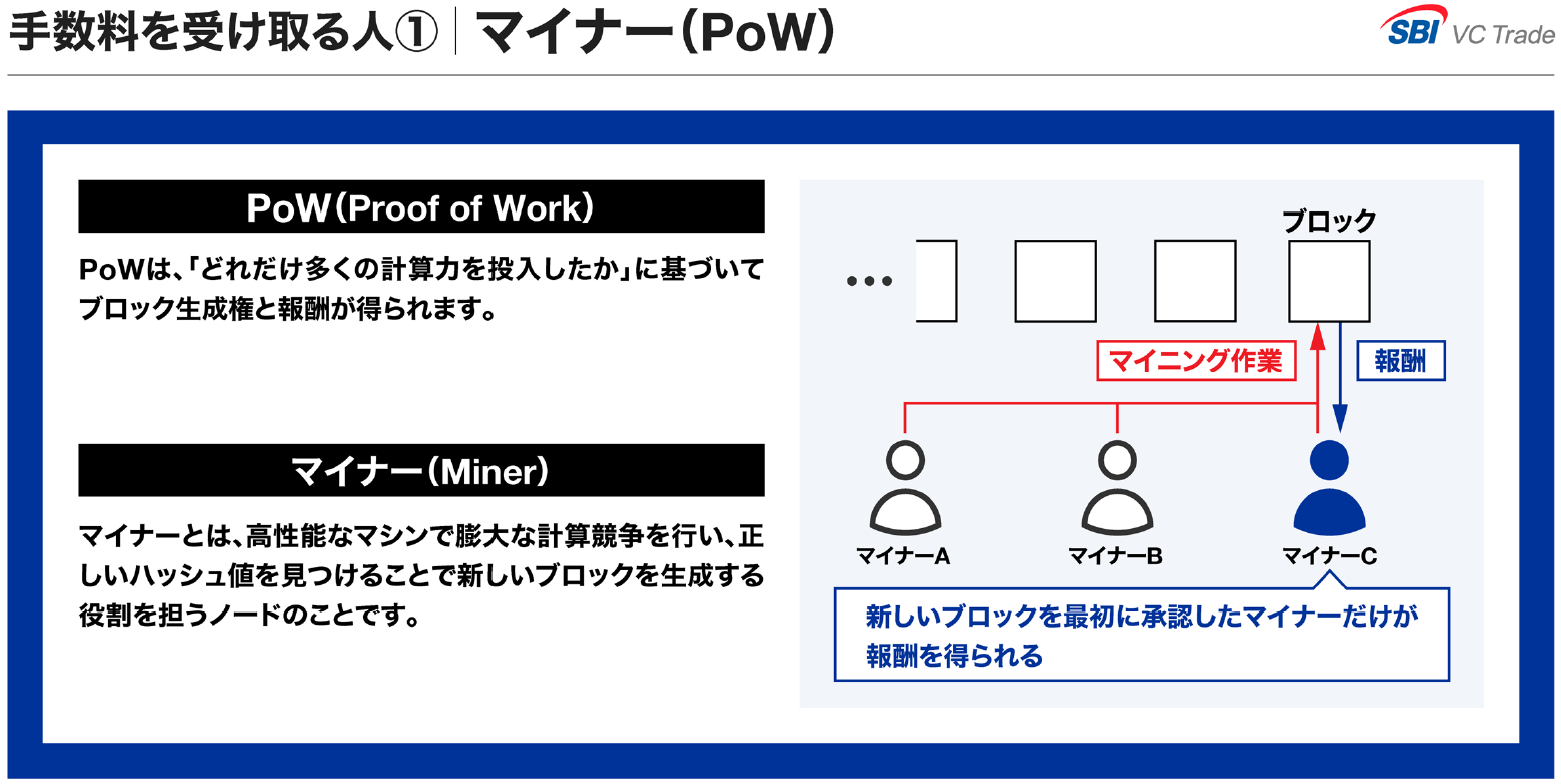 PoWでは、マイナーと呼ばれる参加者が計算処理をして新しいブロックを生成するので、マイナーに対する報酬として「トランザクション手数料」と呼ばれるネットワーク手数料とブロック報酬(新規発行分)が支払われます。