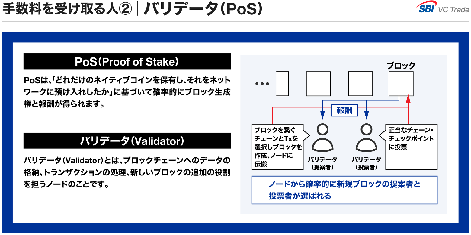 一方PoSでは、取引を検証するバリデータへの報酬として「ガス代」やステーキング報酬(新規発行分)が支払われます。