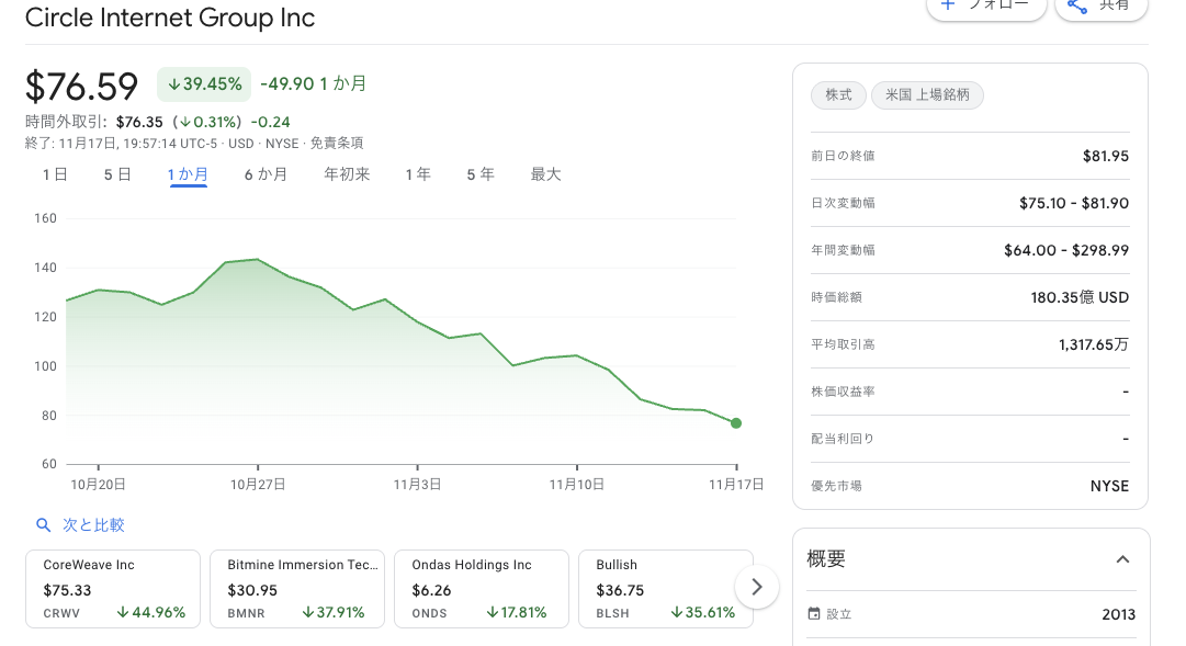 引用:https://www.google.com/finance/quote/CRCL:NYSE(2025/11/18時点)