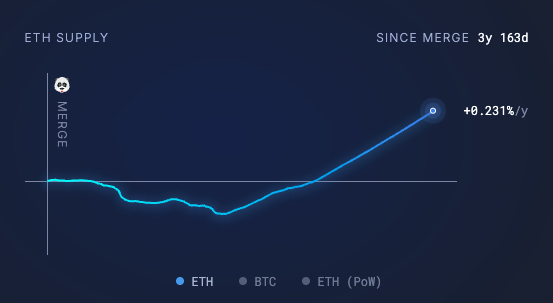 その結果、かつては1日に数千ETHが焼却されることもあった焼却量が激減し、一方でステーキング報酬によるイーサリアム(ETH)新規発行は続くため、ネット供給が再び増加に転じたのです。