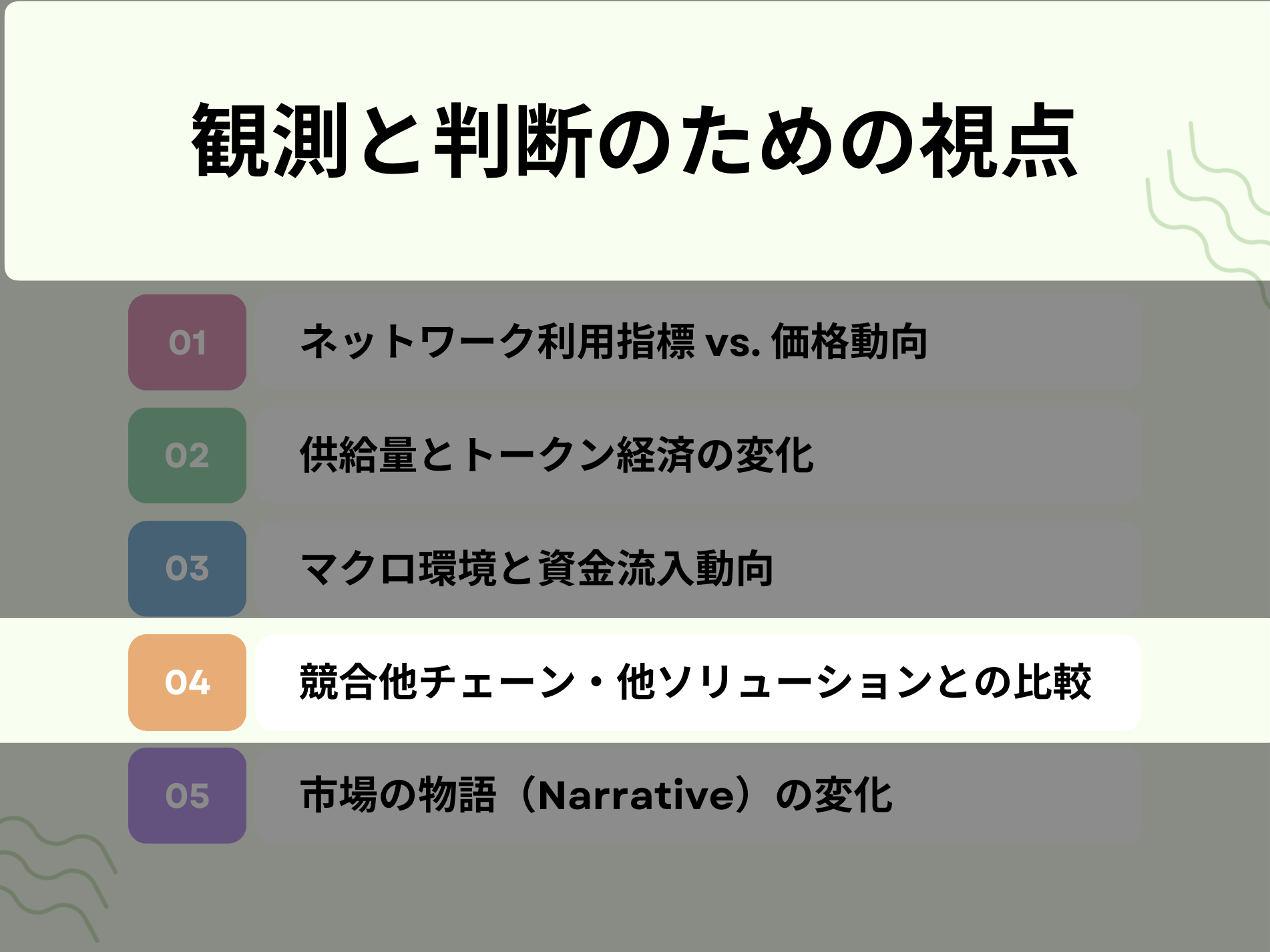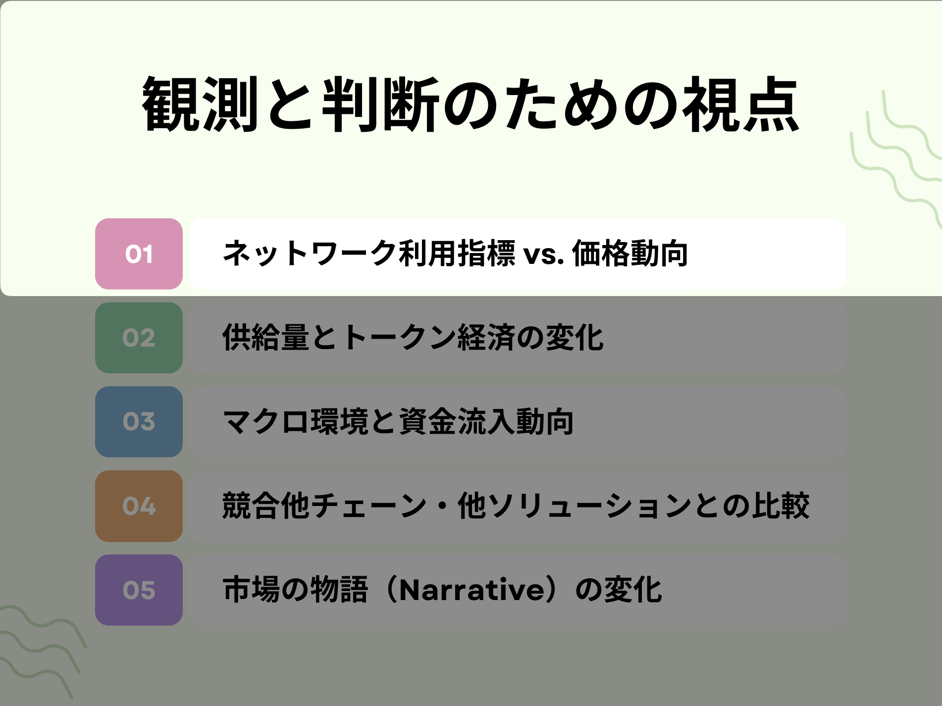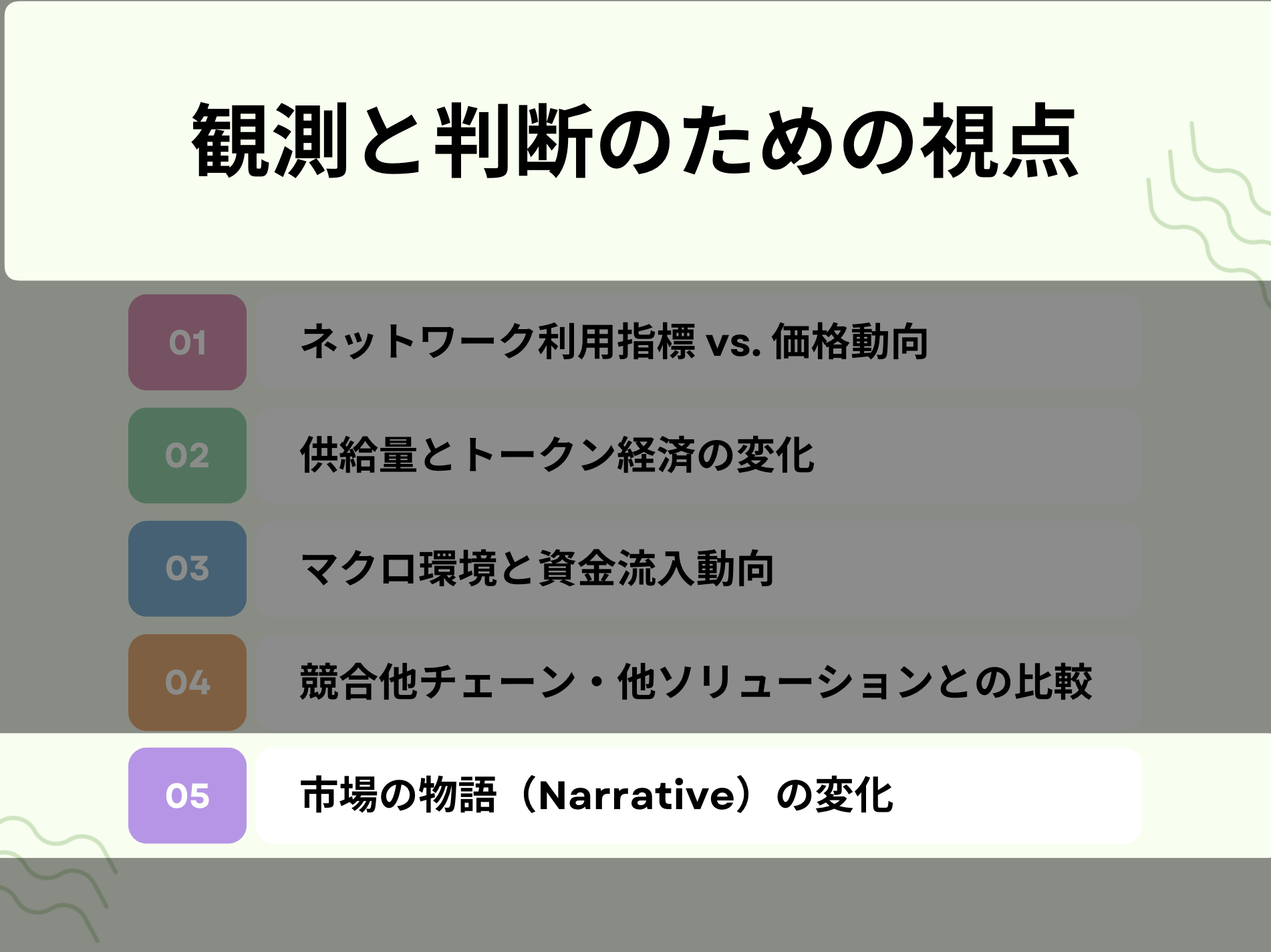 逆に、ネガティブな物語(例:「時代遅れの技術」「中央集権化が進む」等)が広がるようなら警戒信号ですので、日々のニュース動向から市場がどんな物語を信じて価格を付けているのかを読み解く視点が求められるでしょう。
