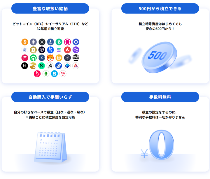 また、ビットコイン(BTC)などの暗号資産をあらかじめ設定した積立金額と積立頻度に基づき、定期的に自動で買い付けできる積立サービスもご利用可能です。