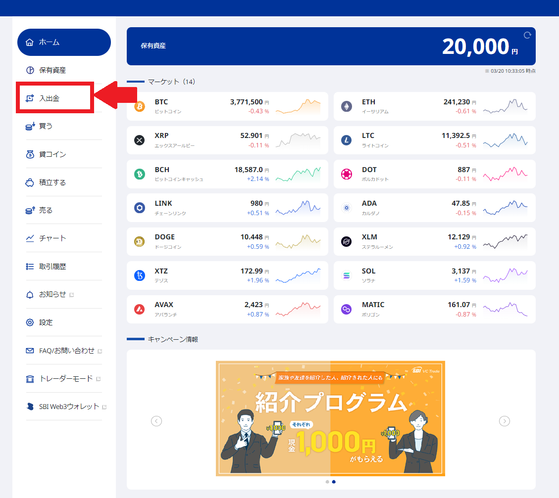 ※スマートフォンの例で入金を行ったため、保有資産が20,000円になっています。