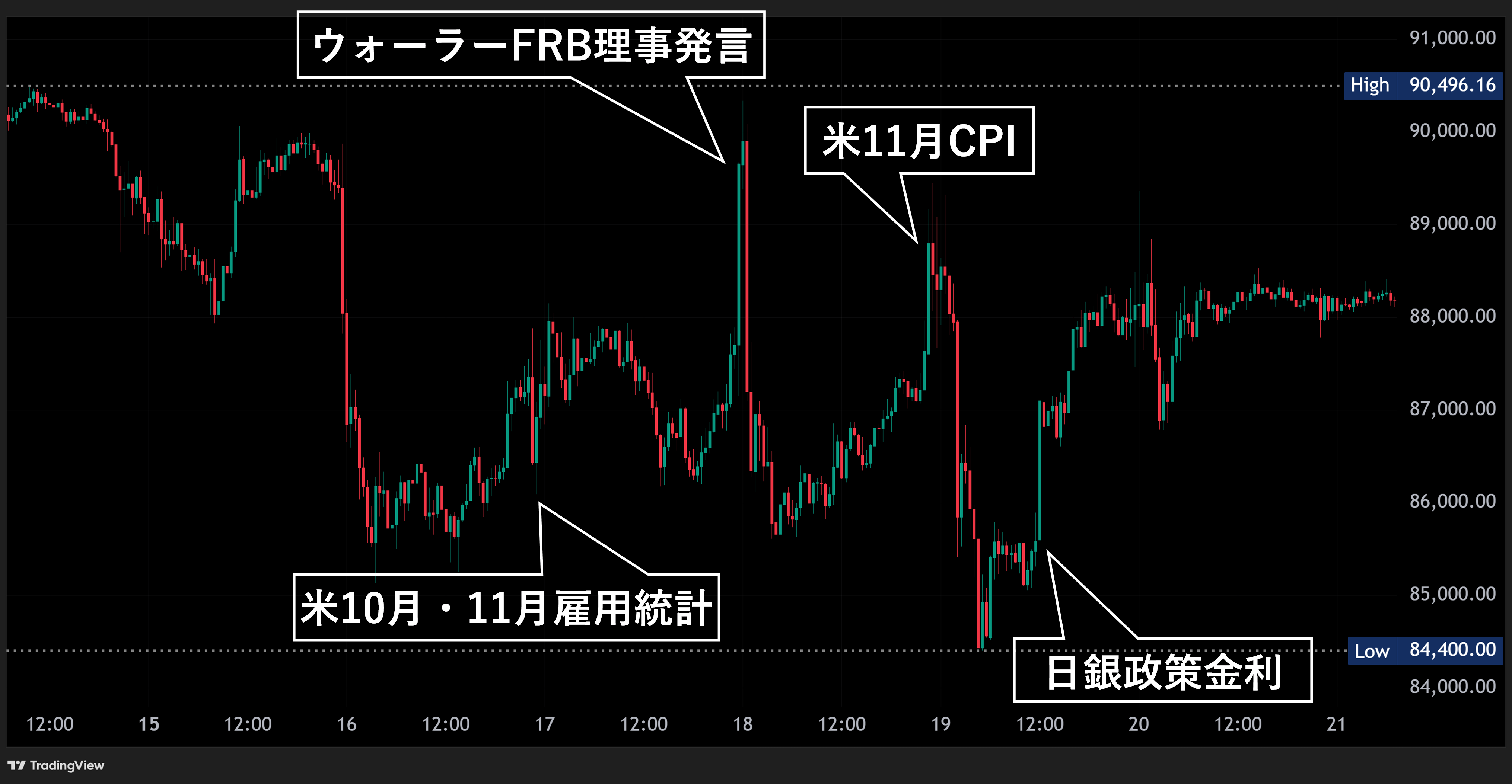 16日に予定通り米雇用統計が発表され、11月の非農業部門雇用者数は64,000人と市場予想を上回ったものの増加幅は小さく、10月の105,000人減少を完全には相殺できなかった。また失業率は市場予想を上回る4.6%と2021年9月以来の高水準となった。ただし今回の米雇用統計は、米国政府機関閉鎖という一時要因の影響を含む可能性が高く、労働市場の減速を示唆しつつも、FRBの政策判断に直結する材料としては慎重な解釈が求められる内容だった。このためビットコイン価格も発表直後は一時的に下落したもののすぐに反発し、その後も方向感のあるトレンド形成には至らず、反応は限定的となった。