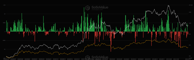 (緑・赤のバーが資金流入出 / 白線が運用資産残高合計/ 橙線がビットコイン価格)