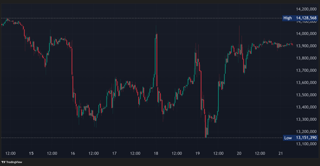 12/14~12/20週におけるBTC/JPYの週足終値は前週比▲1.14%の13,932,350円、ETH/JPYの週足終値は同▲3.26%の470,465円であった(※終値は12/20の当社現物EOD[12/21 6:59:59]レートMid値)。