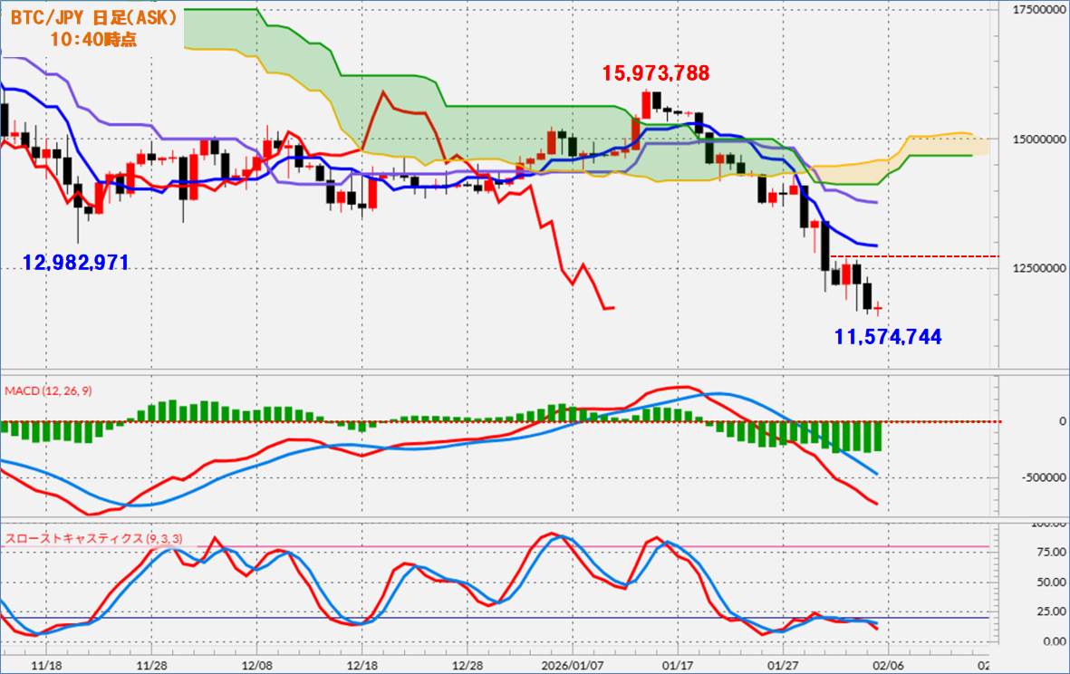 BTC/JPYは、一目均衡表の雲下限ラインを下抜けたことで三役逆転の弱気パターンとなり、一段の下落となっています。ここから下げ止まりが見られて値を戻す動きとなるのか、さらに一段の下落となるのか注目されています。