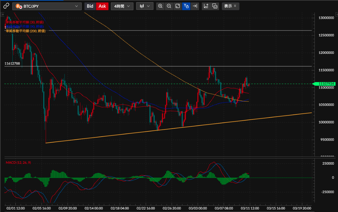 BTC/JPY4時間足チャートの分析です。