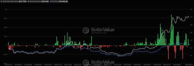 (緑・赤のバーが資金流入出 / 白線が運用資産残高合計/ 青線がイーサリアム価格)