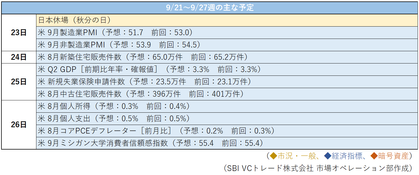 来週は米国において8月購買担当者景気指数(製造業・非製造業)、新規失業保険申請件数、8月コアPCEデフレーターなどが発表される予定だ。9月の利下げ決定を経て、市場の関心は10月1日に期限を迎える米議会のつなぎ予算案の行方、パレスチナを国家として承認した諸外国への米国の対応、そして関税の経済的影響へと移行する可能性がある。加えて、GENIUS法案の運用方法に関するパブリックコメント募集が進む中、米銀行業界がステーブルコインの利払い権限を暗号資産取引所に付与させまいと圧力を強めている点も、市場に影響を与え得る要因として注視したい。