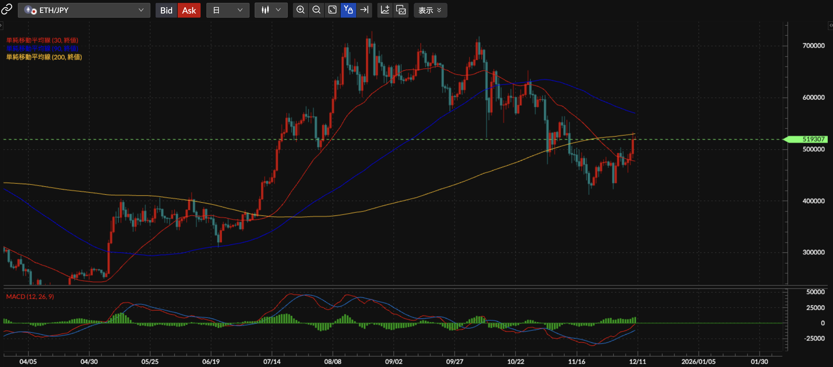 ETH/JPYの日足では、価格がSMA200(橙)まで反発してきました。この200日線は非常に強力なテクニカル節目であり、ここから上値を追う展開は慎重な判断が求められます。