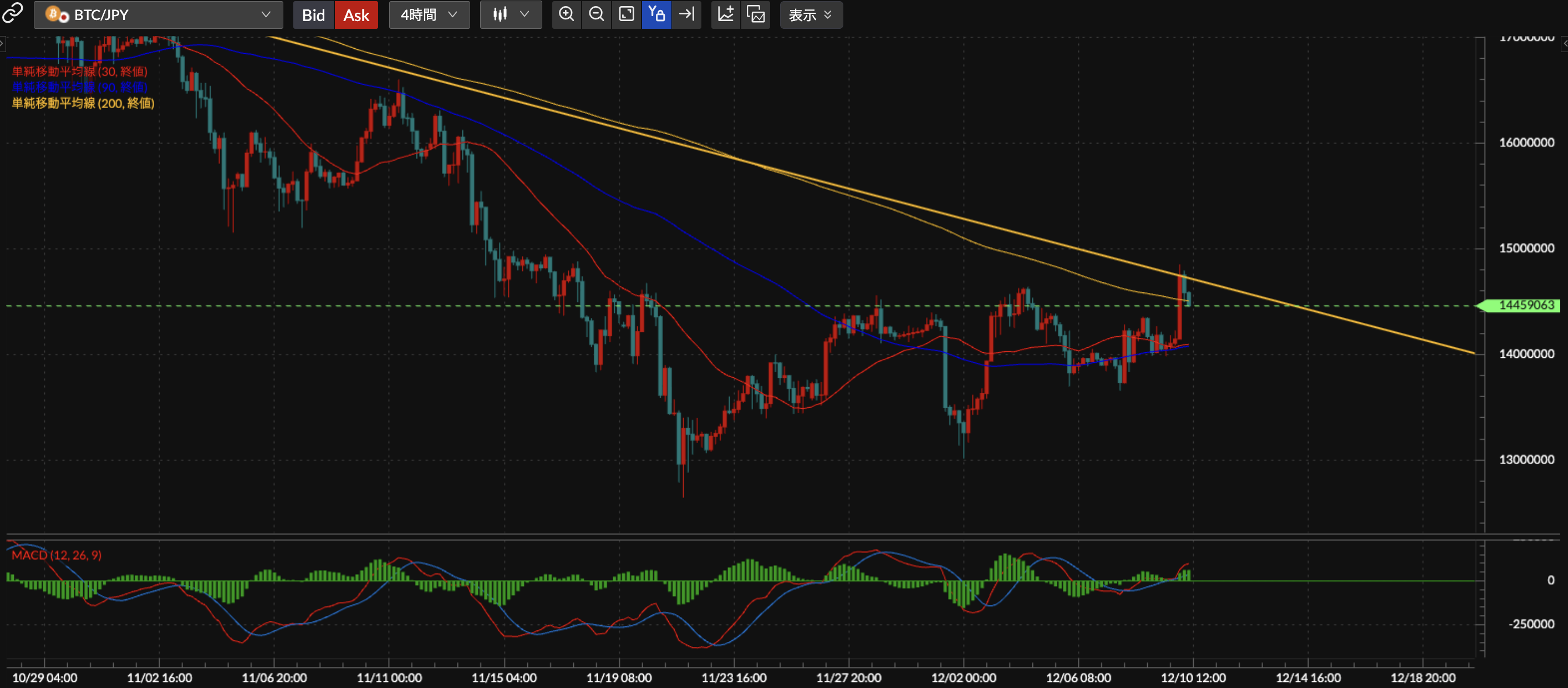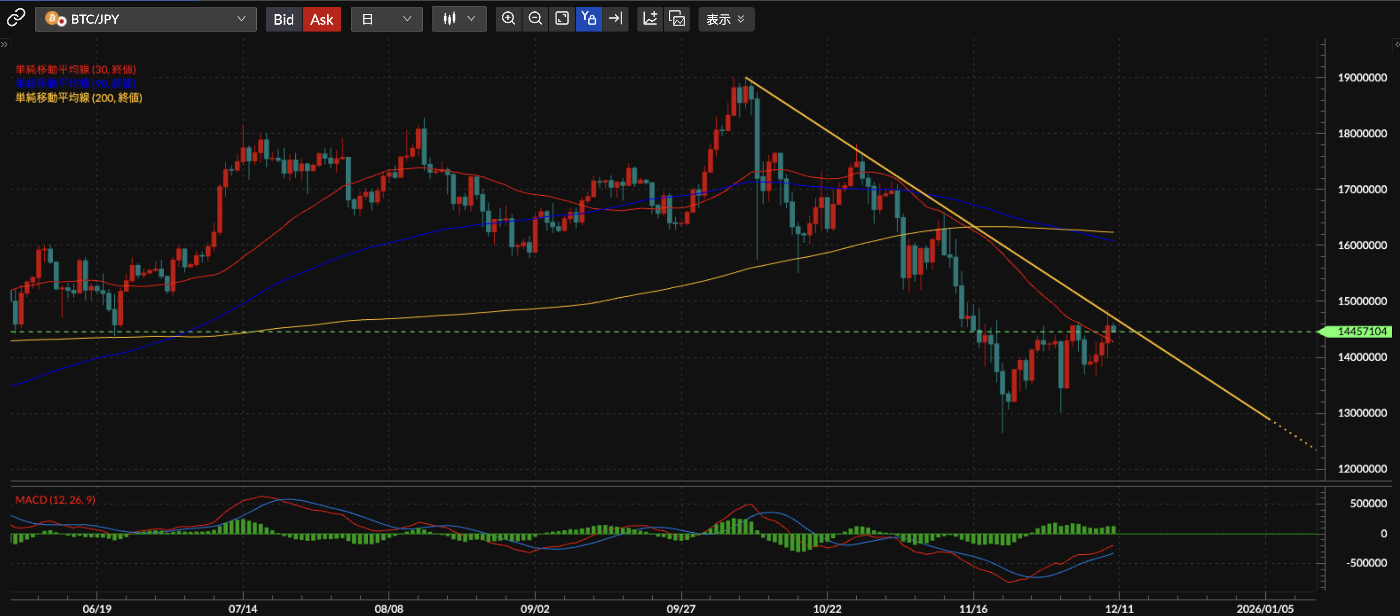 BTC/JPYの日足チャートを見ると、価格は下降トレンドラインに到達しており、ここを明確に突破できれば強い反発上昇のシナリオが開けます。上値のターゲットとしては、SMA90(青)やSMA200(橙)が位置する1600万円付近が意識される展開となりそうです。