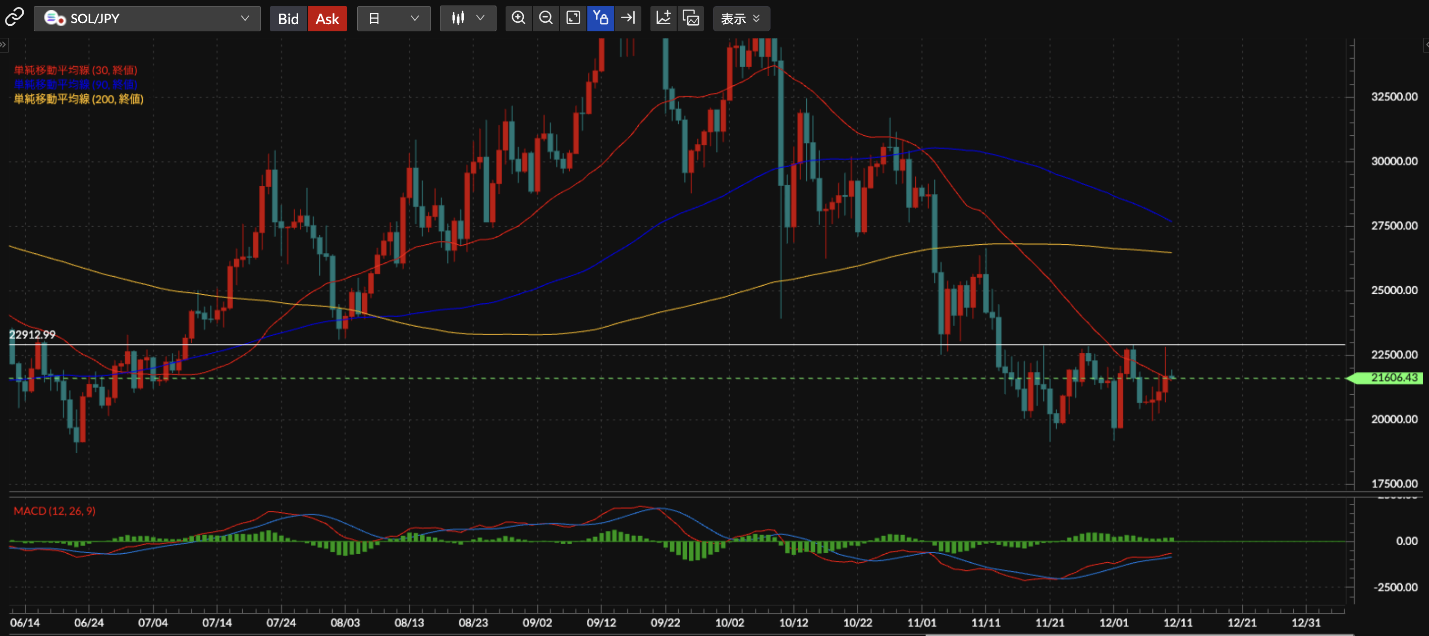 SOL/JPYの日足チャートは、ETHとは対照的に弱い形状が継続しています。反発局面があっても勢いは限定的で、上髭を残しながら売りに押し戻される動きが目立ちます。