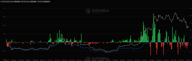 (緑・赤のバーが資金流入出 / 白線が運用資産残高合計/ 青線がイーサリアム価格)