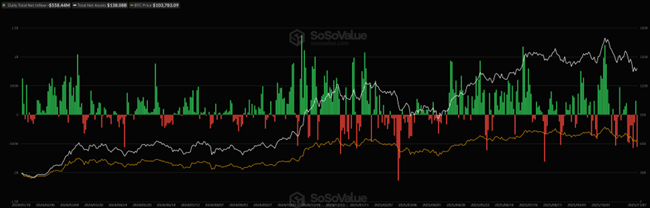 [ビットコイン現物 ETF の資金流入出と運用資産残高合計、ビットコイン価格]