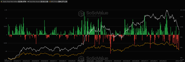 [ビットコイン現物 ETF の資金流入出と運用資産残高合計、ビットコイン価格]