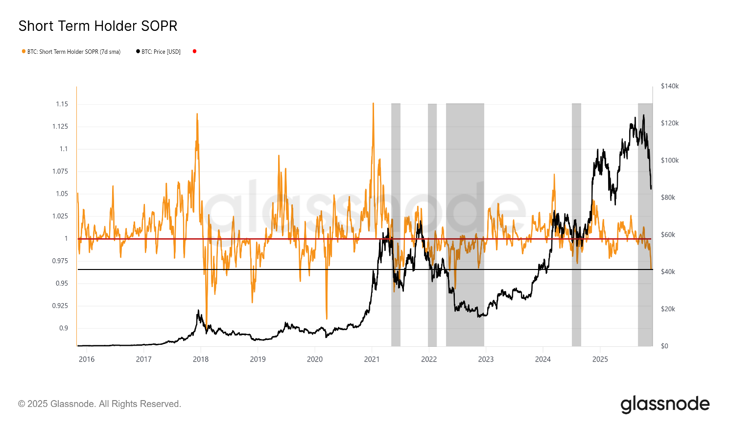 [ビットコインのShort-Term Holders SOPR、過去10年]