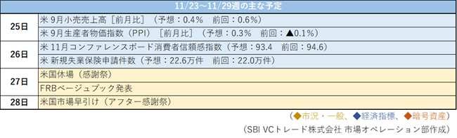 来週は米国市場が27日の感謝祭で休場となり、翌28日は短縮取引となる。これまで公表が延期されていた米9月小売売上高および生産者物価指数(PPI)が発表されるほか、主要指標の公表スケジュールが順次明らかになる見通しであり、引き続きこれらの動向を注視する必要がある。
