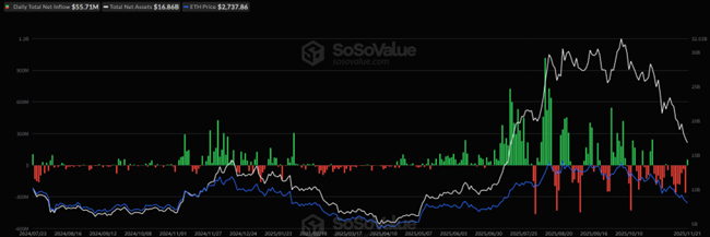 (緑・赤のバーが資金流入出 / 白線が運用資産残高合計/ 青線がイーサリアム価格)