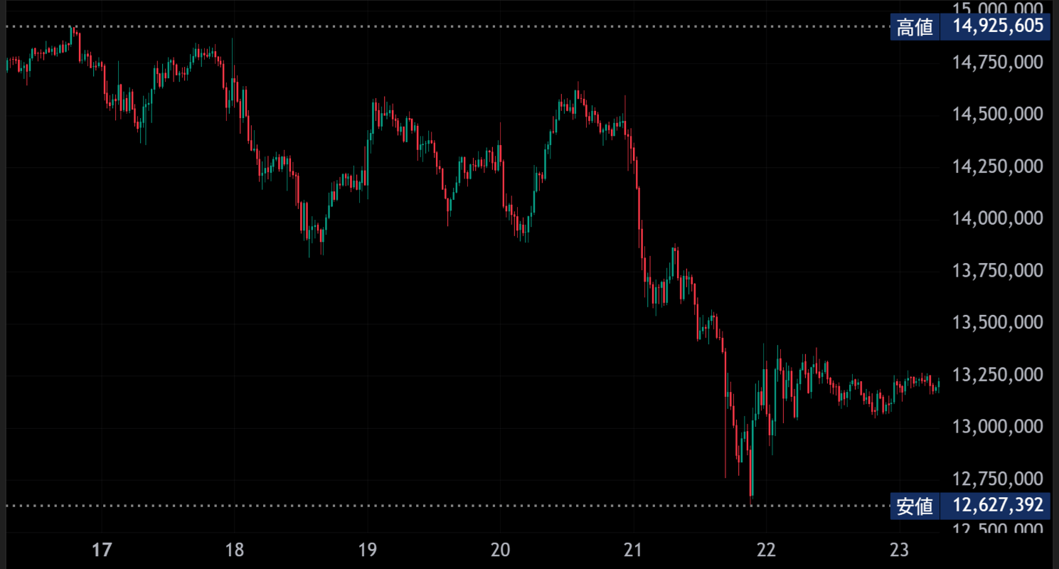 11/16~11/22週におけるBTC/JPYの週足終値は前週比▲10.43%の13,195,900円、ETH/JPYの週足終値は同▲11.93%の430,040円であった(※終値は11/22の当社現物EOD[11/23 6:59:59]レートMid値)。
