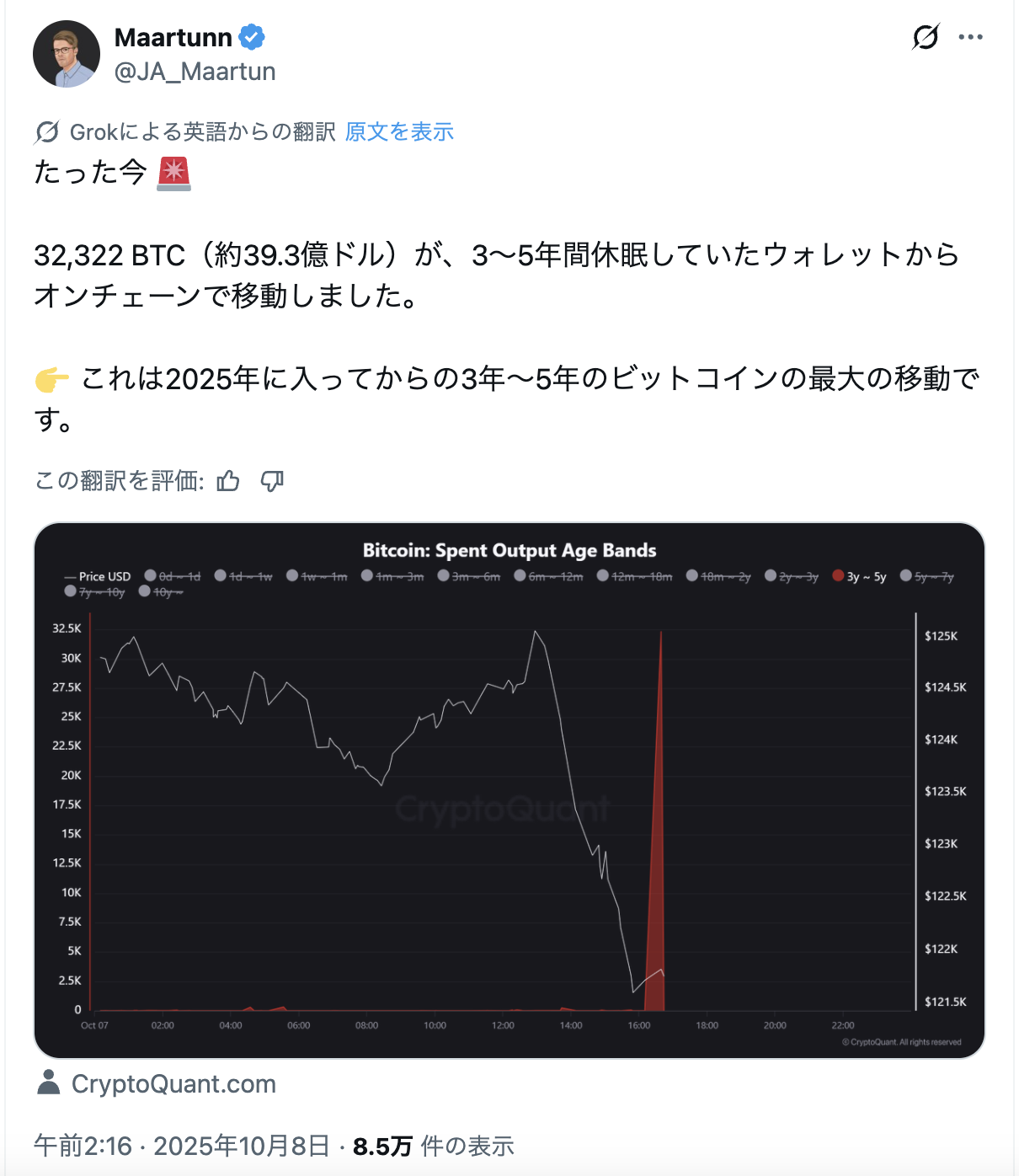 特段の悪材料は見当たりませんが、オンチェーンデータによるとBTCの大口資金移動が確認されており、これが売り圧力を強めた要因とみられます。