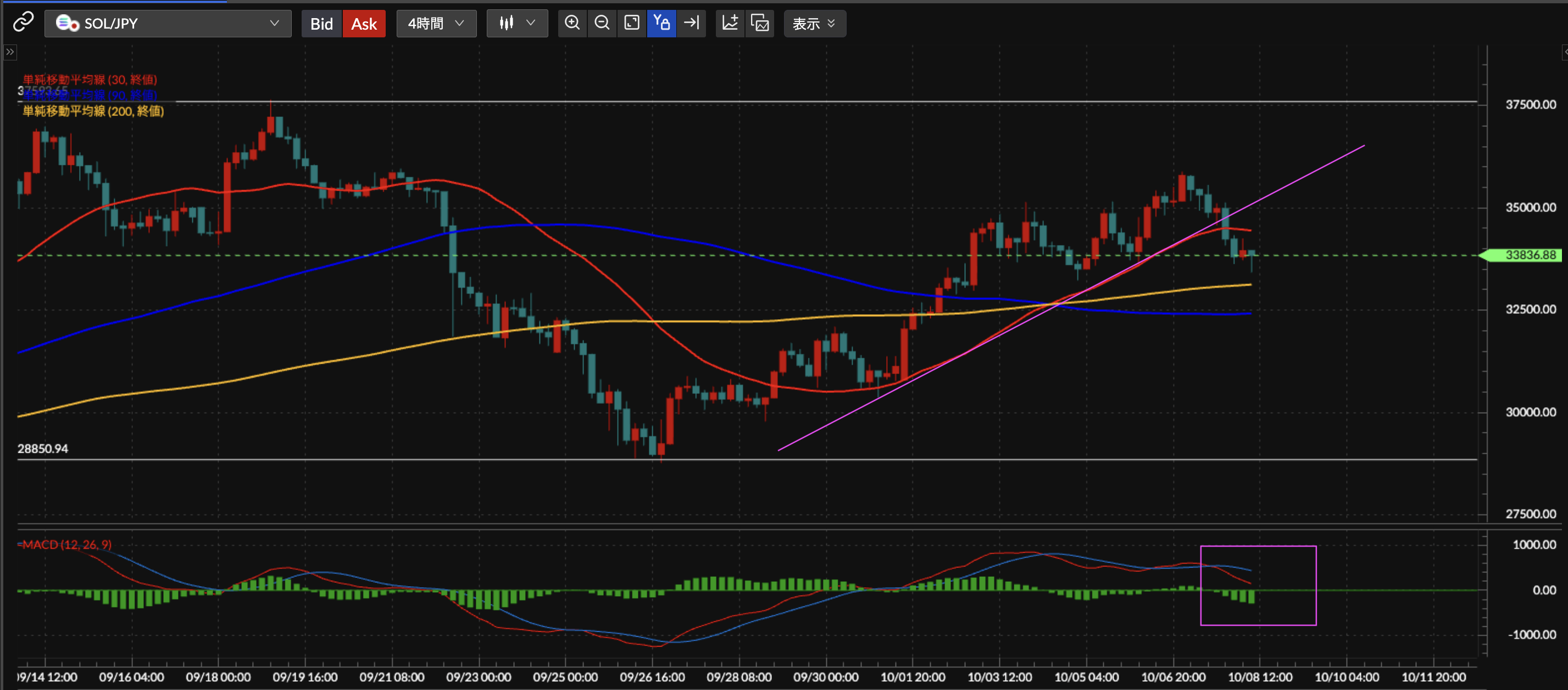 ETHに比べるとチャート形状が弱く、トレンドライン割れに加え、MACDでダイバージェンスが確認されました。