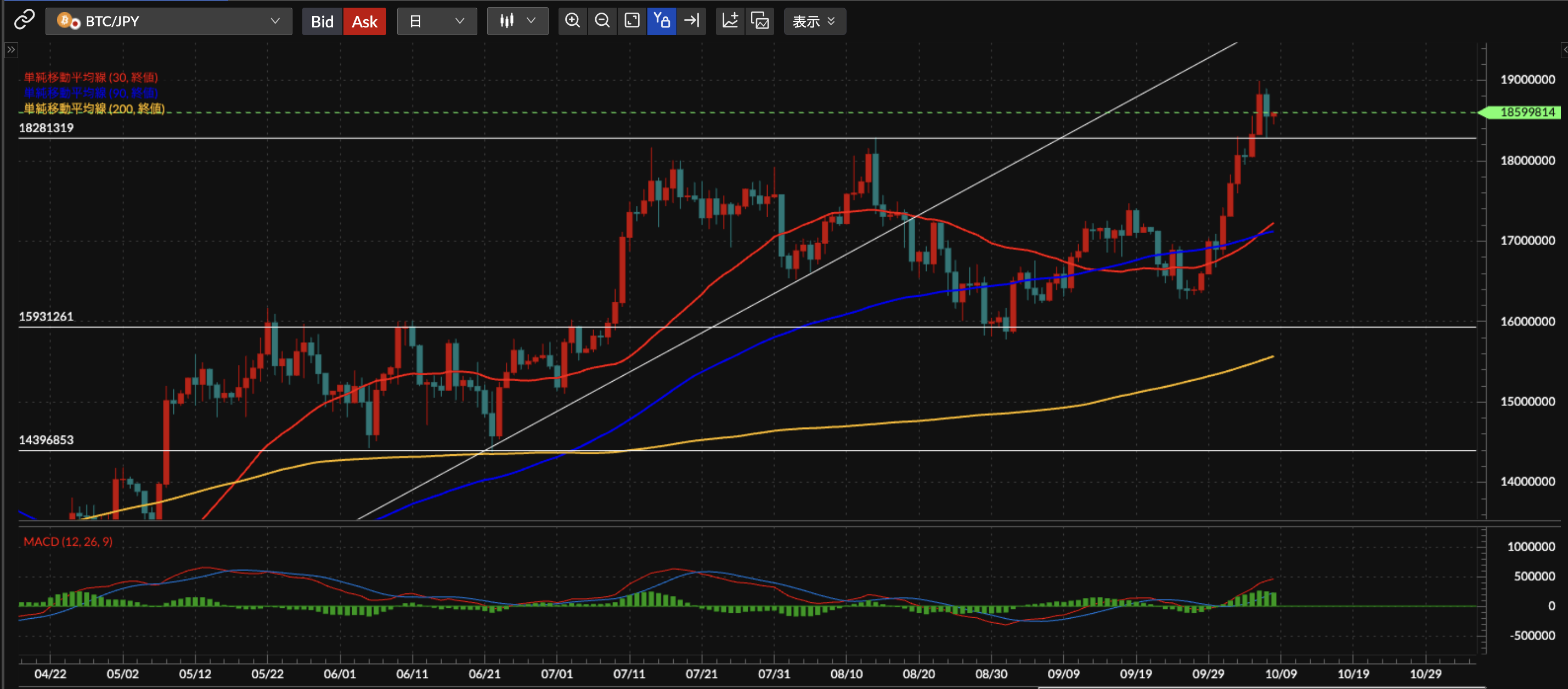 引き続きドル円の上昇トレンドが続く限り、BTC円建てチャートは上昇基調が維持される可能性が高いでしょう。