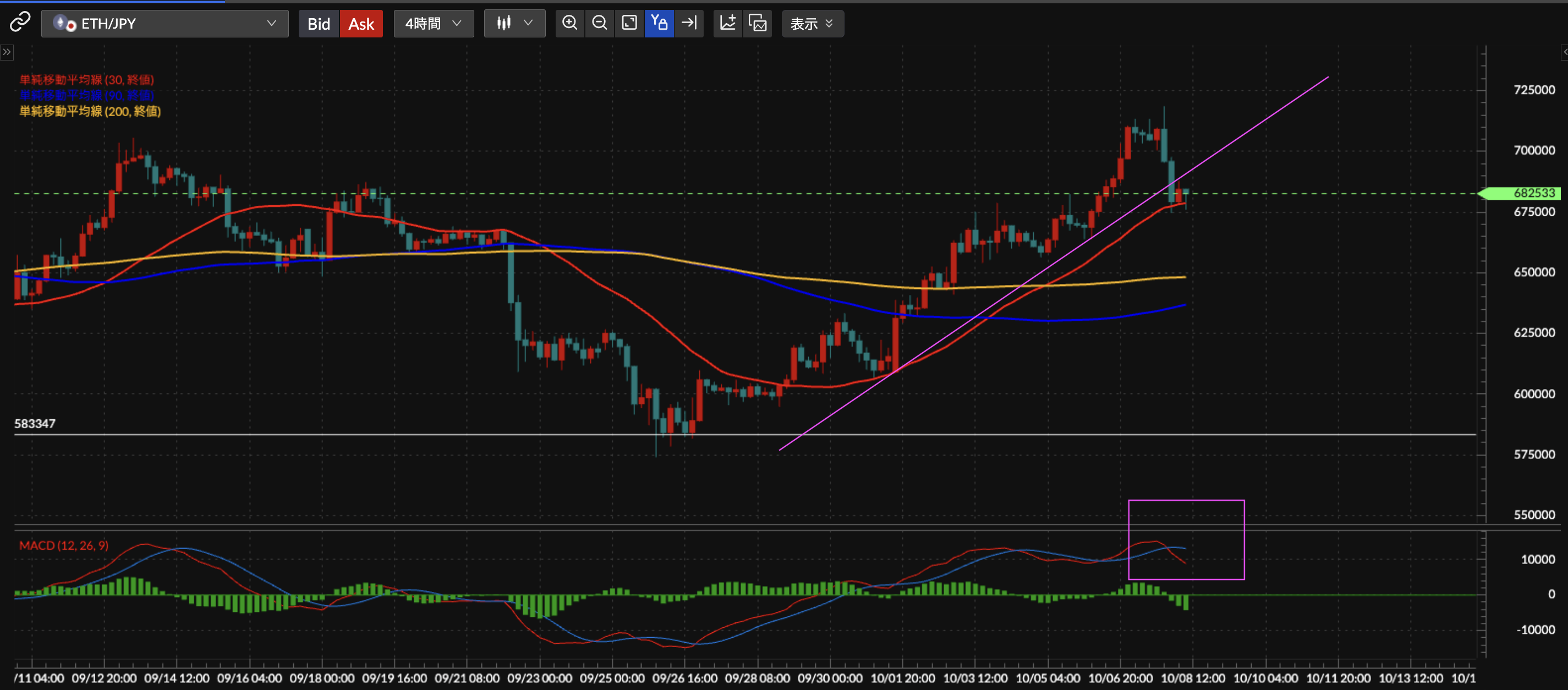 ■ETHは高値圏で一服、70万円手前での縮小も一案