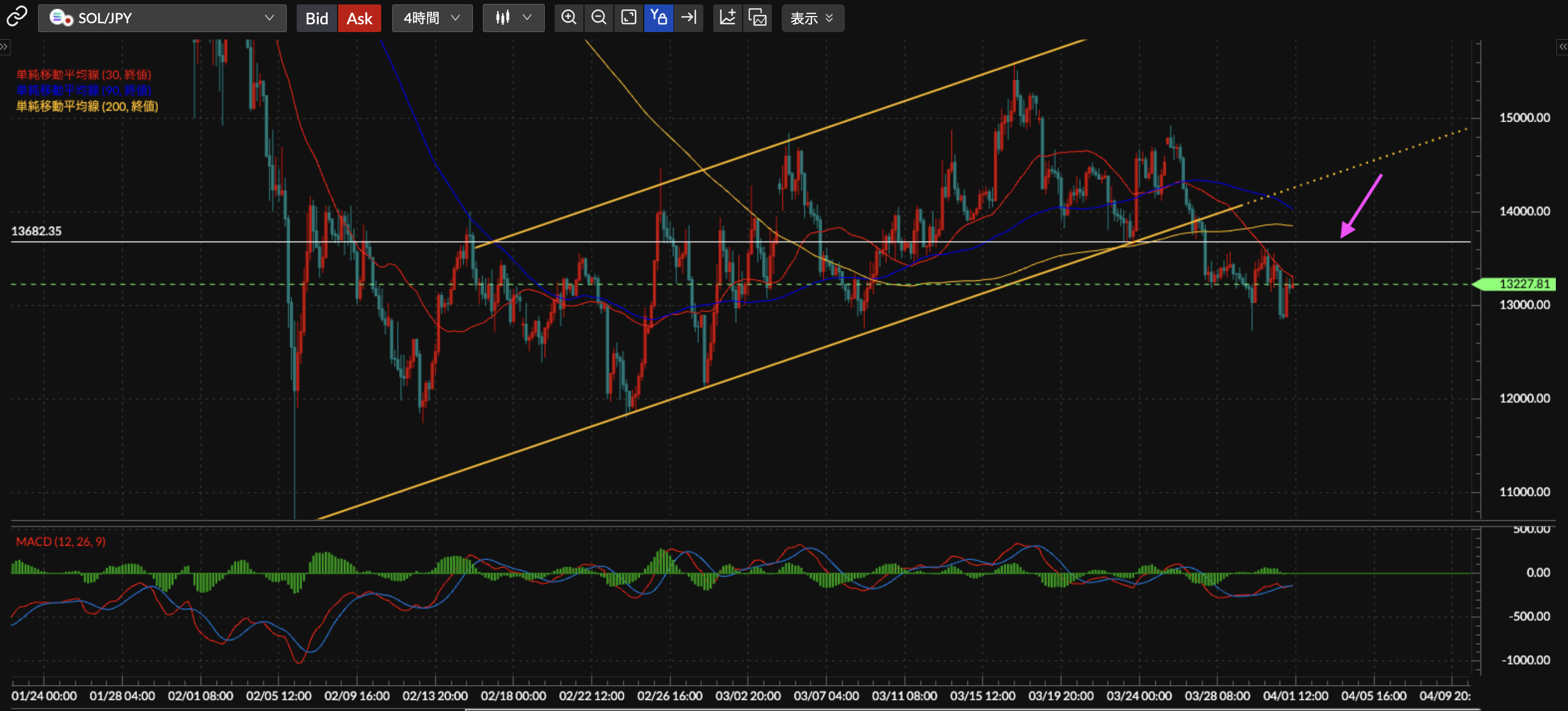SOL/JPY4時間足チャート分析です。