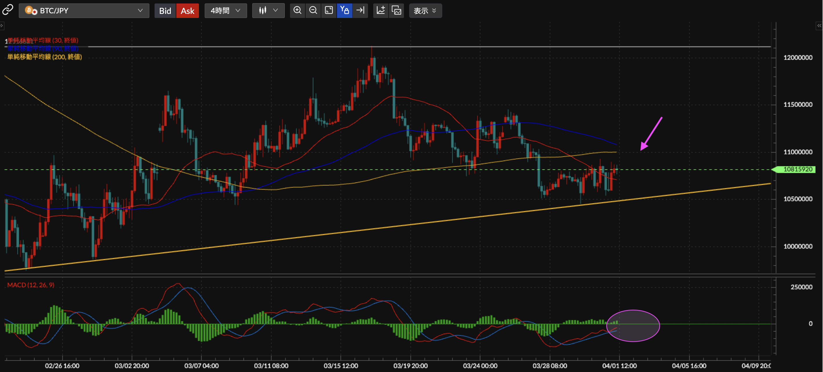 BTC/JPY4時間足チャート分析です。