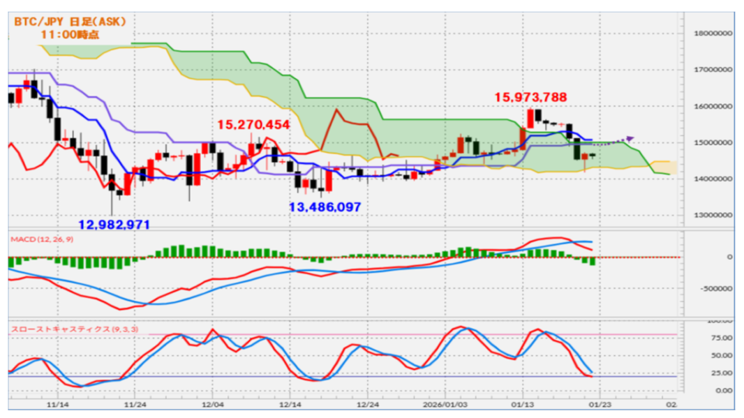 このことから、目先3-5営業日程度は底固い動きが考えられ、その際に基準線・転換線、さらには雲上限ラインも上抜ける展開となる場合には一段の上昇となり、直近高値の15,973,788を目指す可能性も考えられます。