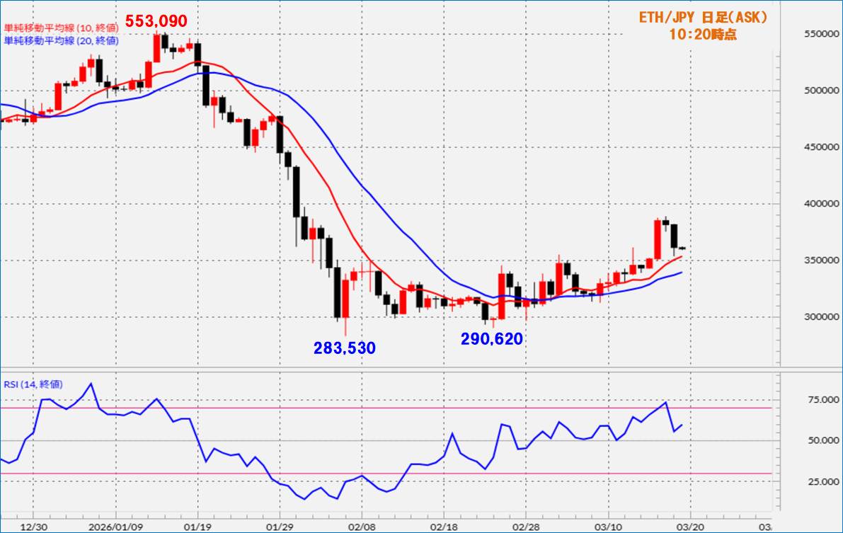 ETH/JPYは、10日移動平均線と20日移動平均線の上側で推移しており、堅調な動きとなっていましたが、直近ではやや失速しています。ここから移動平均線を下抜けて軟調な動きとなるのか、移動平均線でサポートされて底固い動きとなるのか注目されています。