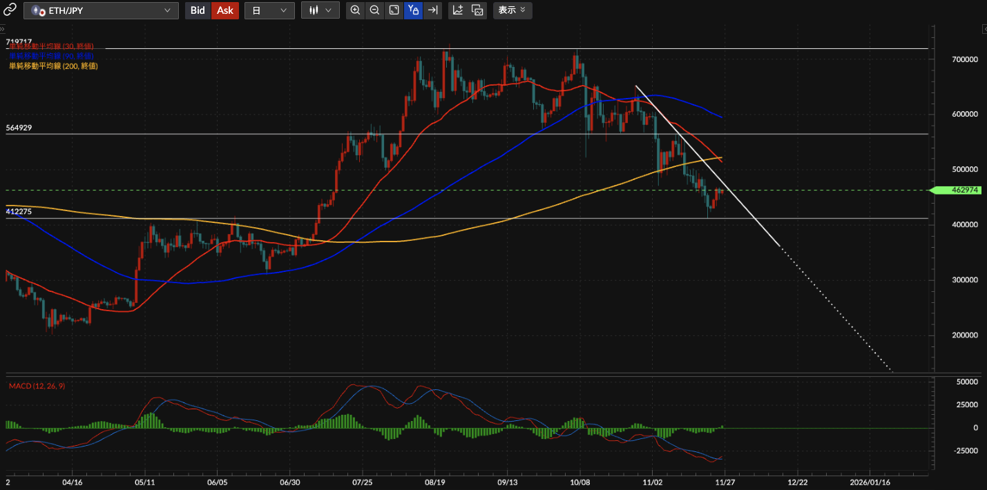 ■ ETH(4時間足):47万円台が分岐点突破なら上昇加速の可能性