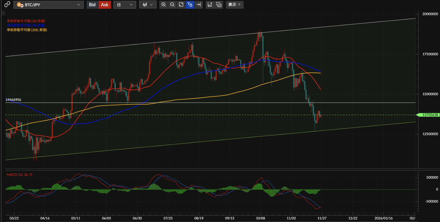 21日(金)、ビットコイン(BTC)は一時1,270万円付近まで下落しましたが、引けにかけ反発。今週の戻り高値は1,400万円付近となり、安値から約10%の切り返しという強いリバウンドを見せました。背景として、ビットコインETFからの断続的な売りが続いていた点が挙げられます。