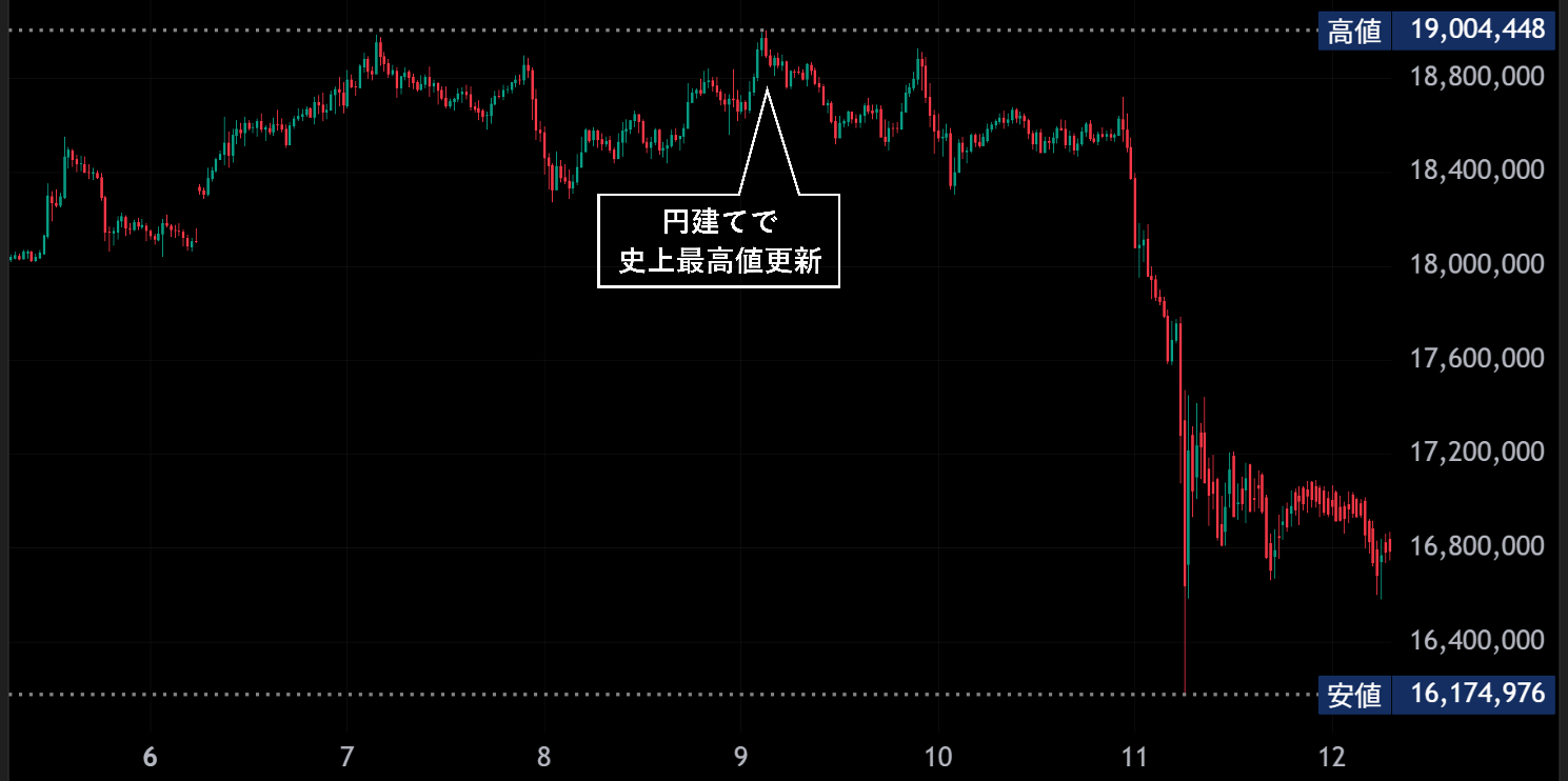 先週の暗号資産市場は、ビットコインがドル建て・円建ての双方で史上最高値を更新したものの、トランプ大統領が中国に対して「11月1日から100%の関税を課す」と発言したことを受け、米中間の貿易摩擦が再燃。これを背景に、過去最大規模となる強制清算が発生した週となった。