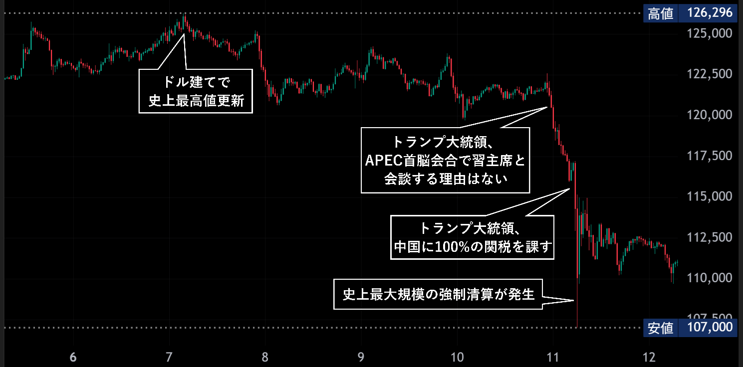 史上最大規模の清算と米中摩擦の影響:ビットコイン最高値後に急落した一週間