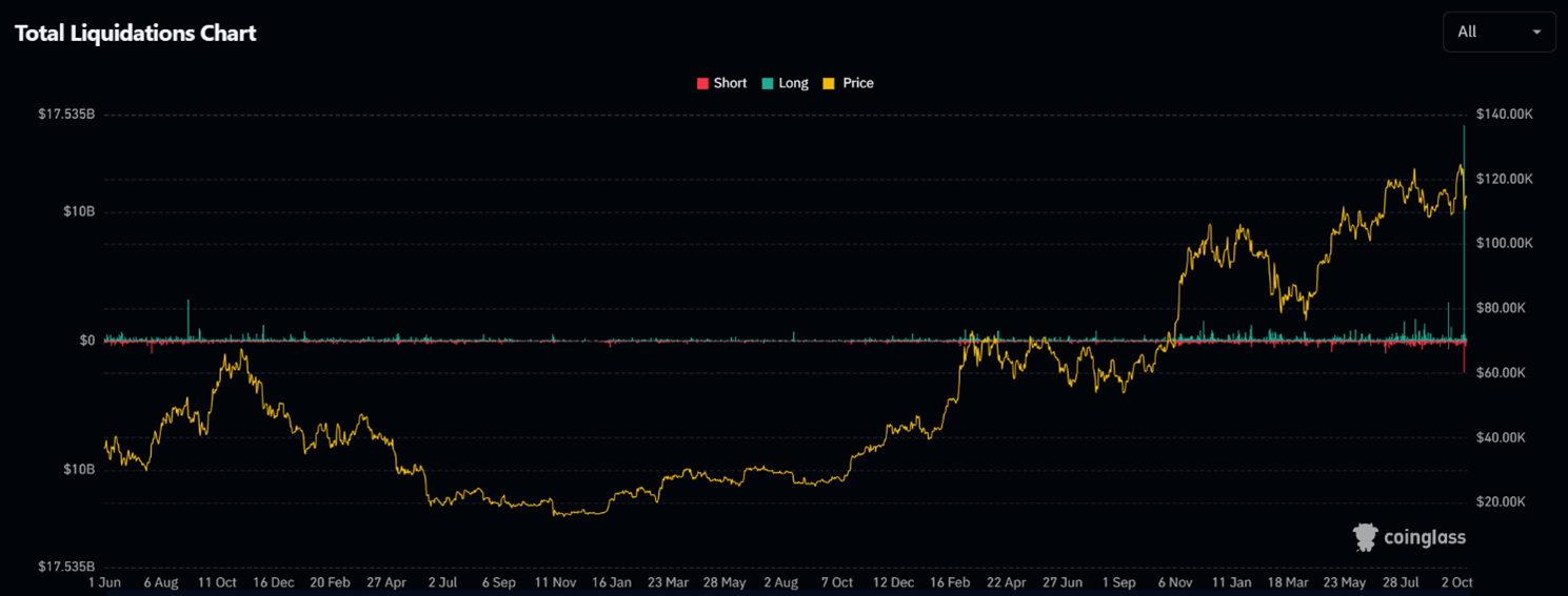 金曜日の米国市場クローズ後、トランプ大統領は改めて「11月1日から中国製品に100%の関税を課す」と発言。これを背景に暗号資産は急落し、約191億ドル以上に達する史上最大規模の強制清算が発生した。これは、過去のFTX破綻時(16億ドル)やコロナ・ショック時(12億ドル)を大幅に上回る規模である。ビットコインはトランプ大統領の発言で最大11.8%下落した10万7,000ドル、イーサリアムは18.9%安い3,510ドルまで下落したが、その後はそれぞれ11万3,900ドル、3,960ドル付近まで急反発するなど、極めて高いボラティリティを示した。